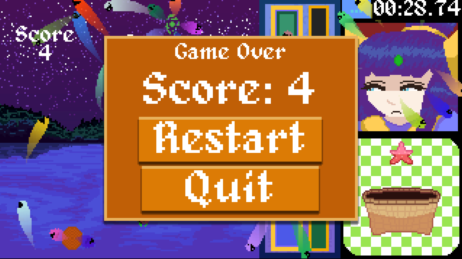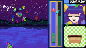 This is a simple fishing bullet hell game where your objective is to catch as many fish as you can before you lose by getting hit or letting the progress bar run out. You can catch around 50 different kinds of fish, and see all the fish in the game through the Gallery.
